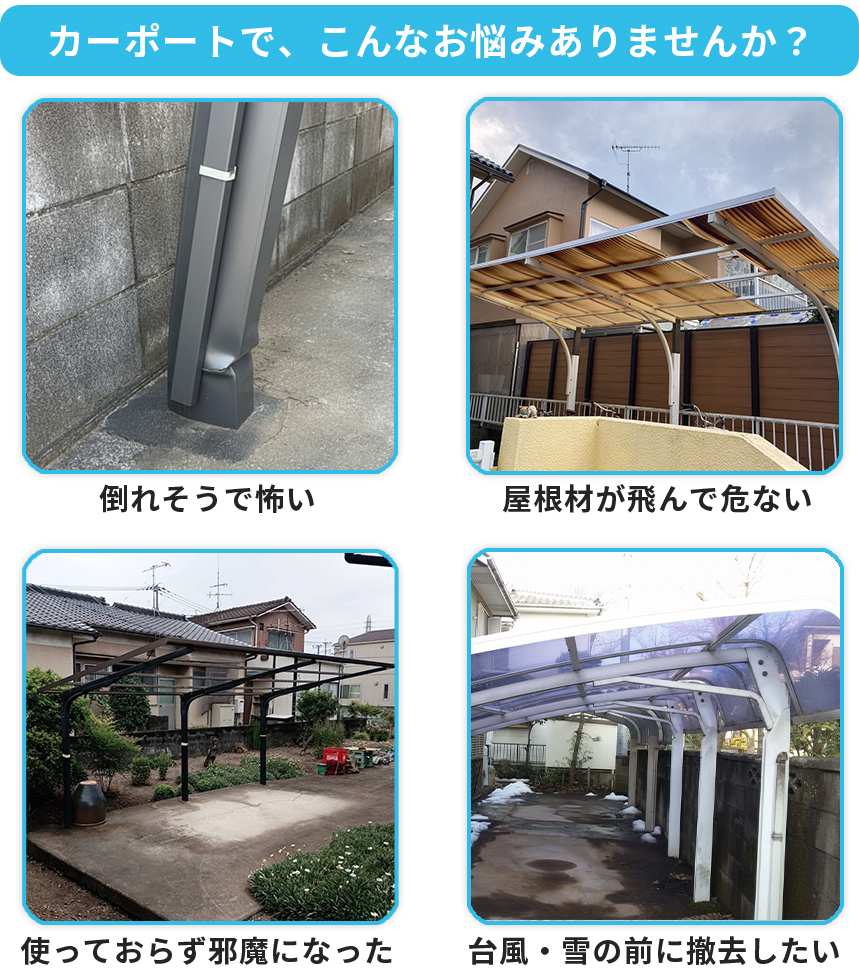 メッセージ:カーポートの劣化は放置すると被害が大きくなることが少なくありません。グラつきを我慢して使い続けて支柱の腐食が進む、強風で屋根材(ポリカ)が割れて飛散する、倒れかけて車や外壁を傷つける——そんなトラブルも実際に起きています。私たちは経験豊富な職人と連携し、現地で状態を確認したうえで、安全・確実な撤去を行います。