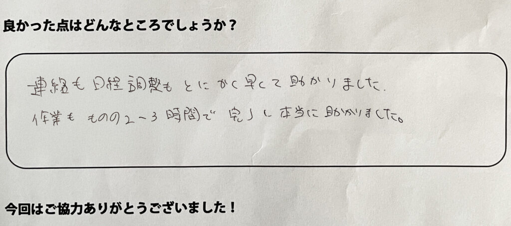 連絡も日程調整もとにかく早くて助かりました。作業もものの2~3時間で完了して本当に助かりました。