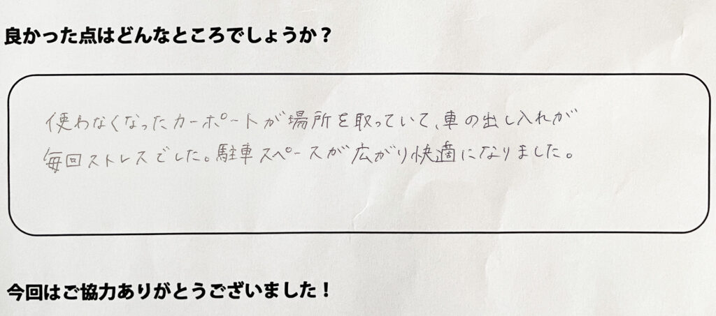 使わなくなったカーポートが場所を取っていて、車の出し入れが毎回ストレスでした。駐車スペースが広がり快適になりました。