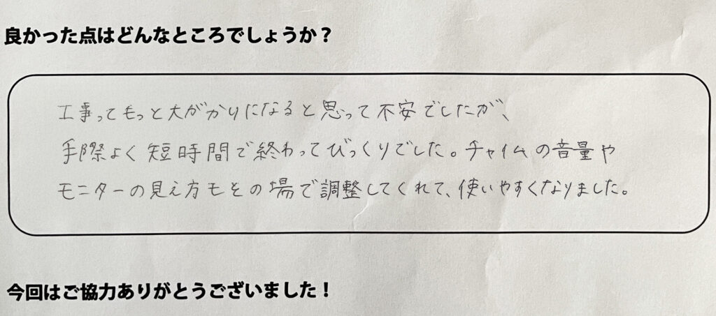 工事ってもっと大がかりになると思って不安でしたが、手際よく短時間で終わってびっくりでした。チャイムの音量やモニターの見え方もその場で調整してくれて、使いやすくなりました。