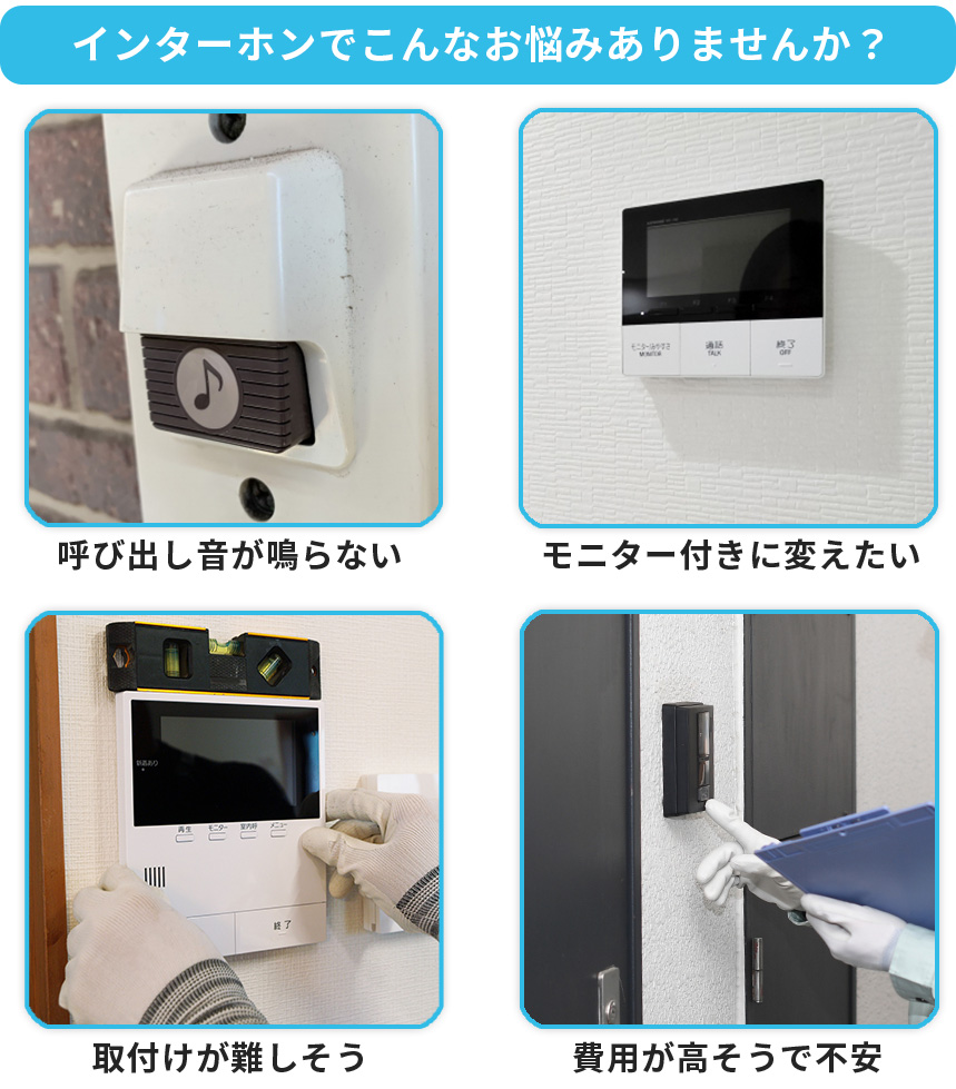 「鳴らないから来客に気づけない」「夜の来訪が不安だから早く替えたい」など、お急ぎのご相談もお任せください。インターホンの不具合は防犯面の不安につながりやすく、放置すると生活のストレスも増えがちです。